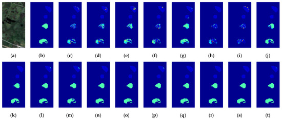 Classification results on SV dataset. (a) original HSI; (b) ground truth; (c) MLR; (d) SVM; (e) RF; (f) ELM; (g) CNN2D; (h) PPF; (i) SF_pixel; (j) SF_patch5; (k) SF_patch7; (l) ViT; (m) SimpleViT; (n) CaiT; (o) DeepViT; (p) ViTPM; (q) LMViT; (r) ATSViT; (s) Ens1; (t) Ens2.