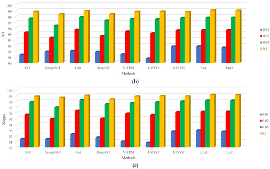 The number of training samples is one of the key factors that impact classification accuracy. Generally, with more training samples, the final classification accuracy tends to be higher. In the previous experiments, 10% of the labeled ground truth samples were randomly selected as training samples. In this section, based on the UP dataset, 1%, 2%, and 5% of the samples were randomly chosen as training samples. The experiments were conducted using the same parameters and testing procedures as the 10% sample scenario. The OA, AA, and Kappa coefficients were calculated for different training sample proportions. The results are illustrated in Figure 7.