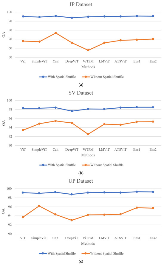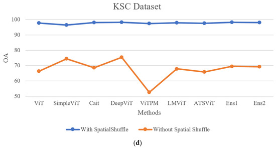 From Figure 8, it can be observed that without spatial shuffle, there are significant differences in the thematic maps, especially for classes with larger training samples, making the contrast more pronounced. This demonstrates the significant improvement in performance achieved through spatial shuffle. Figure 9 presents the classification performance of various ViT-based methods with and without spatial shuffle on four datasets. It can be seen that after incorporating spatial shuffle, all methods show a significant increase in overall accuracy, with more pronounced improvements on the IP and KSC datasets. Without spatial shuffle, the performance of the two ensemble strategies is not always superior to individual methods. However, after incorporating spatial shuffle, the ensemble strategies consistently demonstrate advantages.