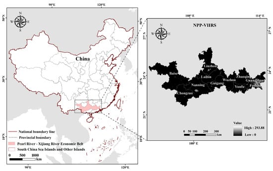 The Pearl River–Xijiang Economic Belt is located between 104°29′E–114°04′E and 21°36′N–26°6′N, spanning across Guangdong province and Guangxi Zhuang autonomous region, uplinked to the provinces of Yunnan and Guizhou, and downlinked to Hong Kong and Macau. It encompasses 11 cities and 88 counties, serving as a crucial strategic region for China’s coordinated and sustainable development as well as its open cooperation with the Association of Southeast Asian Nations countries. The total area of the region is approximately 165,000 km2, and the Yunnan–Guizhou Plateau, Guangxi Basin, Guangdong-Guangzhou Hills, and Pearl River Delta Plain are distributed in sequence from west to east [49]. The region is located in the tropical and subtropical monsoon climate zone and has a pleasant climate, distinct dry and wet seasons, and abundant precipitation.