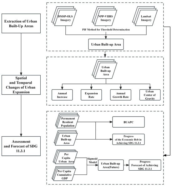 Pseudo-Invariant Features (PIFs) refer to urban areas, typically mature neighborhoods, where the intensity of night-time light emissions remains relatively constant over a certain period of time. These urban features are termed “pseudo-invariant” because their night-time light intensity experiences minimal variation over time [22,53]. This study refers to the normalized threshold method based on the concept of Pseudo-Invariant Features (PIFs) proposed by Wei et al. [22] and Xie et al. [54], which was applied to both DMSP-OLS and NPP-VIIRS night-time light data to derive results. This approach allows for the determination of optimal thresholds for each city, enabling the accurate delineation of built-up and non-built-up areas and obtaining critical information on urban expansion. Based on the extracted urban built-up areas, the spatial and temporal patterns of urban expansion in the economic belt were analyzed. Then, the overall performance of the implementation of SDG11.3.1 and the gap to the 2030 target were evaluated based on SSP1 scenarios (Figure 2).