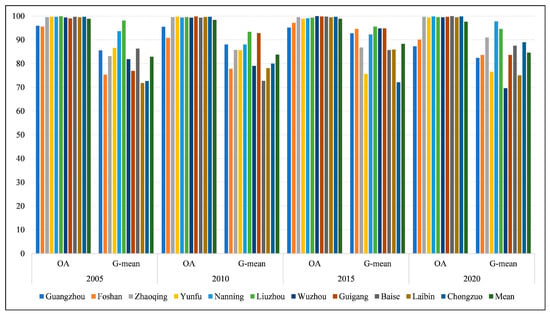 The OA values of the urban built-up area extraction for the four validation years all exceeded 87%, with all average values exceeding 97%. Additionally, except for the G-mean value for Wuzhou City in 2020, which was 69.63%, the G-mean values for the other years of other cities all exceeded 70%, and all average G-mean values exceeded 82%. The validation results indicated that the extraction results were reliable and could meet the requirements for subsequent studies.
