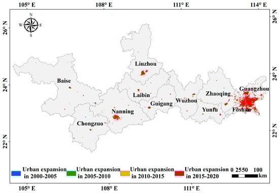 Spatial pattern of urban expansion in the Pearl River–Xijiang Economic Belt from 2000 to 2020.