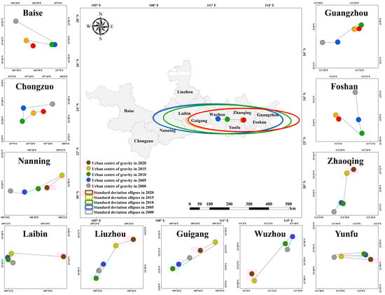 The centers of gravity of Baise City and Yunfu City both moved to the southeast, which was the same direction as the entire economic belt (Figure 6). Guangzhou, Zhaoqing, Nanning, Liuzhou, Guigang, and Laibin showed a clear trend of expansion in the northeast direction. The center migration directions of Foshan, Wuzhou, and Chongzuo were towards the southwest.