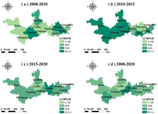 Changes in the LCRPGR in the Pearl River–Xijiang Economic Belt from 2020 to 2030.