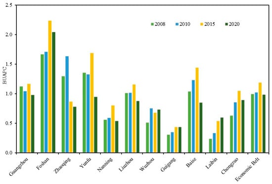 The overall development trend of the entire Pearl River–Xijiang Economic Belt has been consistent, but the expansion and development of individual cities have been uneven (Figure 4). The Guangzhou city of Guangdong province has undergone rapid growth and expansion at a visible speed, which has also driven the development of surrounding cities, especially those with increasingly close connections to Foshan city. Accordingly, rapid growth has been observed in the capital city (Nanning city) and industrial city (Liuzhou city) of the Guangxi Zhuang autonomous region. The other cities in the two administrative regions were not that obvious, which indicates the varying urban built-up area expansion trends among the cities of the Pearl River–Xijiang Economic Belt.