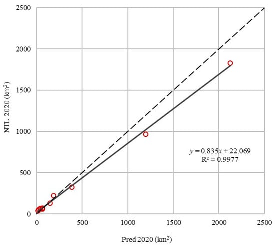 First, all remote sensing data were preprocessed using ArcGIS 10.3, including image mosaicking, cropping, and reprojection. Then, by visually interpreting the Landsat remote sensing images of the baseline year, built-up areas for the 11 cities of the study area were identified and calculated. A comparison analysis was conducted between the built-up areas calculated from Landsat remote sensing images and those extracted from the night-time light data of the baseline year. By applying the binary iterative method in Equation (1), the potential threshold was incrementally increased from 1 by iteratively testing different potential thresholds for partitioning the night-time light data into built-up and non-built-up areas. Until the error (DNt) reaches its minimum value, the potential threshold at this point equals the optimal reference threshold. Hence, the optimal reference threshold for each city can be determined using the night-time light data from the base year [56]. The correlation coefficient of the total built-up area within the economic belt obtained from the two datasets reached 0.998.