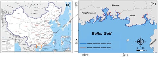 Location of the studied area. (a) The map of China in the upper left corner downloaded from http://bzdt.ch.mnr.gov.cn/ (accessed on 3 June 2023). (b) The coastline underwent significant changes from 1987 to 2018, as a result of coastal reclamation activities.