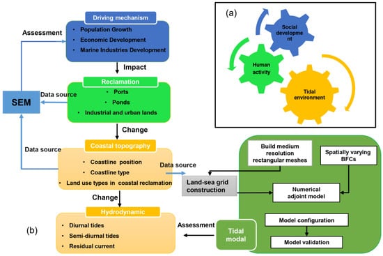 With the rapid population growth and the increase in economic development in the Guangxi Beibu Gulf, converting natural coastlines into artificial coastlines for port development, aquaculture ponds, and industrial purposes was inevitable. Moreover, the length and shape of coastlines are changed greatly by coastal reclamation. Long-term human development activities can effectively alter coastal topography, subsequently reducing or increasing the tidal range, energy, and current velocity. Accordingly, a conceptual framework to study the impact of reclamation on the tidal environment is put forward (Figure 3).