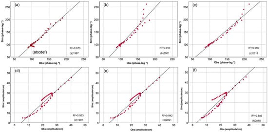 Model verification: The model fidelity was confirmed by comparing it with the tidal harmonic constants observed from the 84 tide gauges. For M2, O1, and K1, the absolute mean error (MAE) deviations between the model results and the observations are 4.0 cm, 3.4 cm, and 6.0 cm, respectively. For the phase lag, the MAEs are 11.7°, 5.7°, and 7.8°, respectively. The MAEs of the two parameter values meet the requirements []. Additionally, for the R2 results for M2 in 1987, 2001, and 2018, the simulated results have a significant correlation with the measurements (Figure 5).