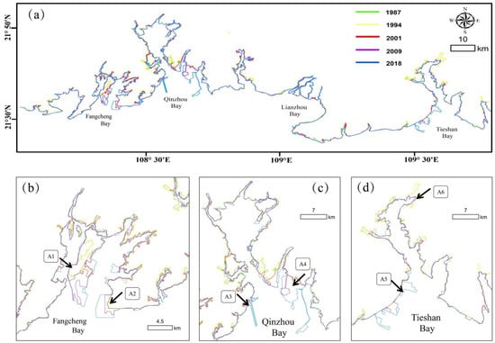 (a) The change in the MWBB in the Guangxi Beibu Gulf from 1987 to 2018. (b–d) The main areas were recorded by remote sensing observation: (A1) located in the port area of Fangcheng Bay, the MWBB continued to extend to the sea from 1987 to 2018. Remote sensing images show that the coastline development was used for urban development before 2001, and the port land was used after 2001. The reclamation area from 2001 to 2009, and 2009 to 2018, reached 12.7 km2 and 5.8 km2, respectively; (A2) located in an area of reclaimed industrial land in Fangcheng Bay, constructed after 2001, with a reclaimed area of 9.4 km2; (A3) two long and narrow breakwaters extending more than 8 km to the sea, located in Qinzhou Bay; (A4) after 2009, a large reclamation project was undertaken in Qinzhou Bay with the aim of utilizing the area for urban and industrial purposes; (A5) three port areas built in Tieshan Bay, among which the middle one was built between 2001 and 2009, and the other two were built after 2009; (A6) a sprawling breeding pond situated in an estuary, covering an area of 6.9 km2.