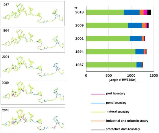 As shown in Figure 7, the increase in aquaculture ponds, and industrial and urban areas, occupied large areas of coastal wetlands and coastline, which led to the total length of the MWBB in the Guangxi Beibu Gulf increasing from 1260.5 km (1987) to 1436.3 km (2018), while the natural boundary decreased by 281.4 km, and the artificial boundary increased by 457.2 km. In 1987, the MWBB was mainly natural landforms, such as bedrock, beaches, and estuaries, accounting for 87.8% of the total length of the Guangxi Beibu Gulf. Marine aquaculture was the main development activity, and the pond boundary accounted for 11% of its length. In 2001, the natural boundary of the Guangxi Beibu Gulf decreased by 147.3 km, while the port boundary, urban and industrial boundary, protective dam boundary, and pond boundary, increased by 12.7 km, 28.1 km, 3.8 km, and 125.6 km, respectively. Among them, the pond boundary increased from 11% in 1987 to 21% in 2001. In 2018, the urbanization process in the coastal areas of the Guangxi Beibu Gulf continued to accelerate, with the natural boundary accounting for 58.2% of the total boundary length in 2018; the proportions of the urban and industrial boundary, port boundary, and protective dams along the coast of the Guangxi Beibu Gulf were increased from 3.6%, 1.1%, and 1.0% in 2001 to 6.0%, 5.8%, and 5.5% in 2018. In addition, the results show that the artificial boundary caused by the reclamation activities increased by 409.3 km, accounting for 89.5% of the new artificial coastline during 1987–2018.