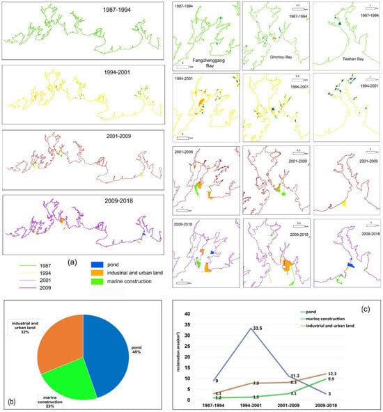 Figure 8a illustrates the spatio-temporal distribution of the land use types in the reclamation areas between 1987 and 2018. Between 1987 and 2001, coastal reclamation was initially aimed at increasing fishery production. However, since the beginning of the 21st century, the focus of coastal reclamation has shifted towards promoting industrial development and urbanization. Hence, we divided the development process into two periods. The first period (1987–2001) saw a surge in large-scale reclamation activities, primarily for the aquaculture pond, with Tieshan Bay being the most prominent area. The second period (2001–2018) marked the pinnacle of the coastal development, with the construction of ports, wharves, and bridges along the coast, as well as the proliferation of large-scale industrial zones, resulting from the extensive land reclamation that spread throughout the Guangxi Beibu Gulf.