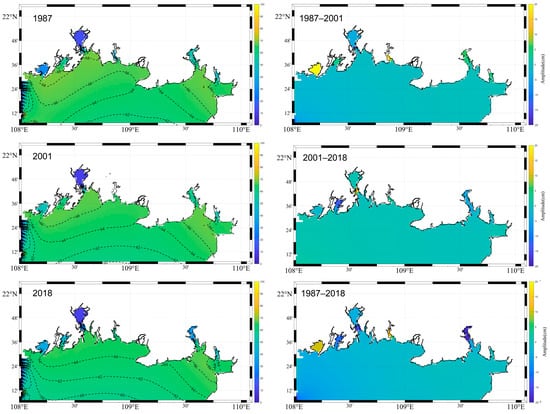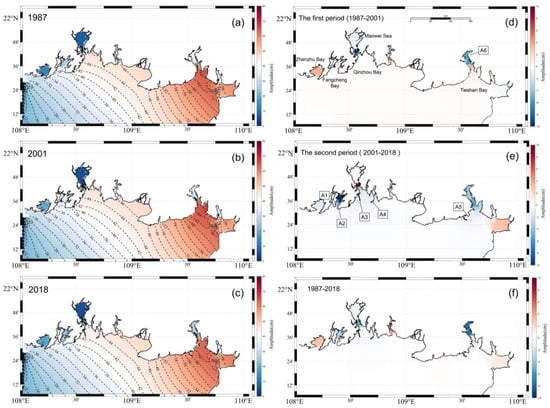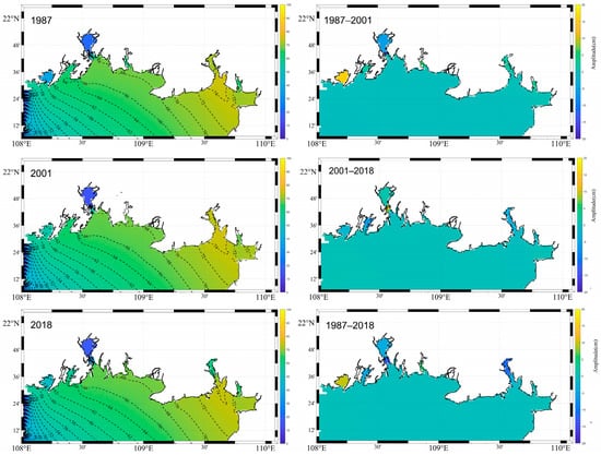 The effects on M2: The co-tidal charts in 1987, 2001, and 2018 are shown in Figure 9a–c; the M2 tide propagates mainly from the South China Sea into the Guangxi Beibu Gulf, and then a main branch of it propagates northwestwards into Tieshan Bay, while the small branch propagates westwards into Lianzhou Bay. When the tidal wave reaches Qinzhou Bay, part of it turns into the Maowei Sea, and the other part spreads southwards to the area adjacent to the southwest of Qinzhou City. The largest amplitudes of M2 tides can reach 70 cm in Tieshan Bay and the smallest M2 amplitude (less than 6 m) appears in the Maowei Sea, caused by the characteristics of a wide interior and narrow mouth. These variations are consistent with the conclusions by Pan et al. []. The semi-diurnal tidal wave experienced considerable changes from 1987 to 2018 due to the coastline change (Figure 9d–f), and the change in the M2 tidal amplitude was between –0.08 and 0.06 m. The maximum and minimum changes in the tidal amplitude appear in Sanniang Bay (located on the right side of Qinzhou Bay) and Tieshan Bay, respectively.