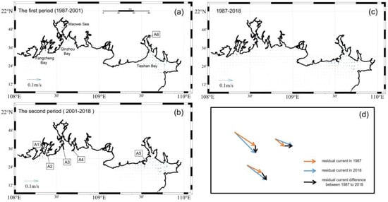 The effects on the residual current: In this paper, the Lagrange residual current principle is used to calculate the residual current. Figure 12 shows the distribution of the residual current in 2018. The strongest tidal current appears in Tieshan Bay, showing a clockwise rotation in the southern strait. Meanwhile, the second strongest tidal currents occur in the areas southeast of Zhenzhu Bay, exhibiting a counterclockwise direction. The residual current experienced considerable changes from 1987 to 2018, due to the coastline changes. The magnitude of the flow velocity changed by 0.01 m/s to 0.03 m/s (Figure 13c). The maximum difference in the residual current appears in the channel between the Maowei Sea and Qinzhou Bay.