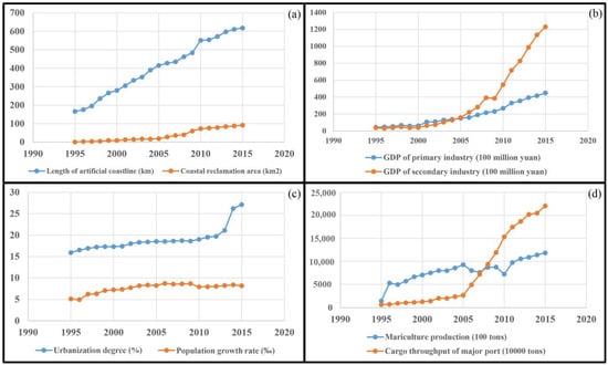 Figure 14a shows that the artificial boundary and accumulated reclamation area significantly increased over 20 years. We further analyzed the trend in the sub-indexes increase from the statistical results on the socio-economic index in Guangxi Province between 1995–2015 and note a sharp increase after 2005, especially in the secondary industry GDP, the accumulated reclamation area, and the cargo throughput of major ports (Figure 14b,d). However, in contrast to the coastal GDP, the rate of population growth remained almost stable, while the urbanization degree shows slow but steady increases; from 1995 to 2015, the urbanization degree increased from 15.9% to 27.1%; both indexes did not match the rate of economic and reclamation area increase (Figure 14c).