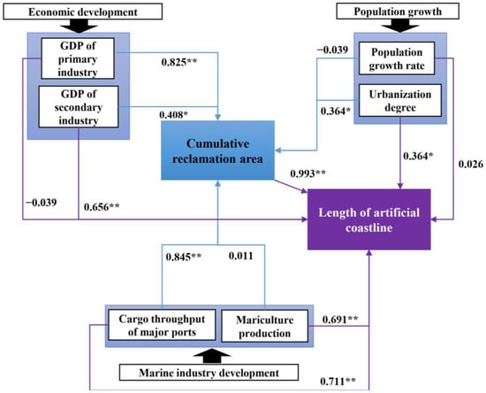 SEM to estimate the magnitude and significance of relationships between population growth, economic development, marine industry development, and reclamation. * p < 0.05, ** p < 0.01.