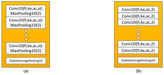Convolutional neural networks (CNNs) have been widely applied in a number of computer vision tasks, and their use has gradually extended to other fields because of their advantages of sparse connectivity and weight sharing. Many research works also confirmed that CNNs have a strong feature extraction ability in solving classic signal-processing problems such as spectrum sensing, modulation classification, and SEI. In the LTS-SEI framework, extraction of shallow features of samples also relies on convolutional modules. We designed different feature extractors for Datasets A and B, respectively, as shown in Figure 3a,b. For a 1D convolutional layer, represents the number of filters, represents the size of the convolutional kernel, represents the activation function, and represents the convolutional step size. In the final layer of the feature extractor, a 1D global average pooling layer (GAP-1D) was introduced to reduce channel feature dimensions and prevent model overfitting. The following is the extraction process of the feature extractor for the source domain sample feature , and the target domain sample feature can be represented as