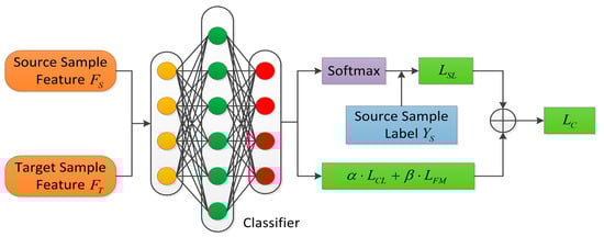- Center Loss: Center Loss was first proposed for face recognition. It can map data with intraclass diversity into feature spaces that are close to each other. Center Loss has been applied in the fields of image classification and modulation recognition to learn discriminative features. By continuously optimizing the distance between features and their clustering centers, similar samples become more compact after being mapped to the feature space. For the classifier we designed (shown in Figure 4), the source domain sample features output by the last fully connected layer are used to calculate the Center loss . Noteworthily, comprises two parts. The first part can reduce the distance between sample features and their class centers to enhance intraclass compactness of features. The second part will control the distance between different class centers to enhance the interclass separation of features. can be expressed aswhere represents the number of small batch samples, represents the feature vector extracted from the source domain sample by the last fully connected layer, and represents the class center corresponding to the real label of . is used to calculate the square Euclidean distance. represents a variable parameter that controls the distance between different class centers. After each iteration, the class centers of the entire training set need to be updated because all training sample features need to be recalculated. However, this is cumbersome and impractical because the model uses only a small batch of samples to participate in training each time. Therefore, we use the mean of small batch sample features to approximate the global class centers. Batch class center can be described aswhere and represent the features and their numbers of the same category as , respectively. Since does not train with the network parameters, we introduce to control the learning rate of to prevent singular samples in the training set from causing considerable fluctuation for class centers in the feature space. The update method of is designed as follows:where represents the class center updated by class at time , represents the class center updated by class at time , and represents the impulse function. When the condition in the parentheses holds, . Otherwise, .