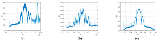 Dataset B comprises data on signal samples from two navigation satellites of the Global Positioning System (GPS). These signals were observed using an Agilent spectrum analyzer, received using a 40 m antenna, and collected using a signal-acquisition device with a 250 MHz sampling rate at the Luonan Haoping Station of National Time Service Center, Chinese Academy of Sciences. Similar to the signal-processing method in Dataset A, Figure 6c shows the spectrum of a navigation signal broadcasted by a GPS satellite at 1575.42 MHz frequency. The spectrum was also calculated and plotted using 10 M data points. The quality of GPS satellite navigation signals collected using a 40 m large-aperture antenna was higher. We conducted 2 years of observation on two GPS satellites and collected multiple long time span signals. Specifically, we constructed 14 data subsets using these navigation signals and labeled them as B1, B2, … and B14, respectively. The time span between these data subsets is approximately in the range of 1–2 months, as shown in Table 2.