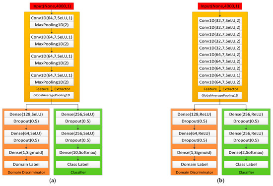 The identification models were constructed using TensorFlow. They were all trained and tested on a workstation equipped with an Intel (R) Core (TM) i9-10900K CPU and NVIDIA GeForce RTX3090 GPU. Figure 7a,b show the recognition models used for Datasets A and B, respectively. The feature extractors, classifiers, and domain discriminators of the two models follow the network structure described in Section 3. The feature extractor of Model A comprises four 1D convolutional modules. Every 1D convolutional module includes a 1D convolutional layer and a maxpooling layer. The feature extractor of Model B comprises 10 1D convolutional layers. They were designed as lightweight as possible to reduce training parameters and time.