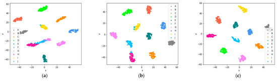 To intuitively understand the recognition features learned by LTS-SEI, Figure 8 shows the 2D scatter maps of features extracted by different methods for A1->A2, A1->A3, B1->B2, and B1->B3. The first column shows the 2D features of the target domain samples output by the model directly trained using the source domain samples. For A1->A2 and A1->A3, it is evident that some features of Specific Emitters G, H, and J are confused. This indicates that even if the time span between signals is small, the trained model is likely to reduce its predictive ability for new data. For B1->B2 and B1->B3, which have longer time spans, the trained model completely confuses the two specific emitters. The second column displays the 2D features of target domain samples output using the existing domain adaptation methods. The confusion between specific emitters G, H, and J in A1->A2 and A1->A3 was alleviated through domain adaptation. However, the two specific emitters in B1->B2 are still unrecognized, and some samples in B1->B3 are confused. The third column presents the 2D features of the target domain samples output by the proposed LTS-SEI method. Clearly, LTS-SEI effectively separates the features of different specific emitter samples. Thanks to the mutual cooperation between its different components, LTS-SEI can extract RFFs with interclass separation, intraclass compactness, and domain invariance. Undoubtedly, these RFFs are crucial in identifying the long time span-specific emitter signals.