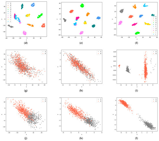 2D feature scatter maps of the output features of the last fully connected layer of the classifier after t-distributed stochastic neighbor embedding dimensionality reduction: (a) A1->A2 (I/Q), (b) A1->A2 (shallow layer: CMD), (c) A1->A2 (LTS-SEI), (d) A1->A3 (I/Q), (e) A1->A3 (deep layer: HOMM), (f) A1->A3 (LTS-SEI), (g) B1->B2 (I/Q), (h) B1->B2 (shallow layer and deep layer: MMD), (i) B1->B2 (LTS-SEI), (j) B1->B3 (I/Q), (k) B1->B3 (shallow layer and deep layer: JDA), and (l) B1->B3 (LTS-SEI).