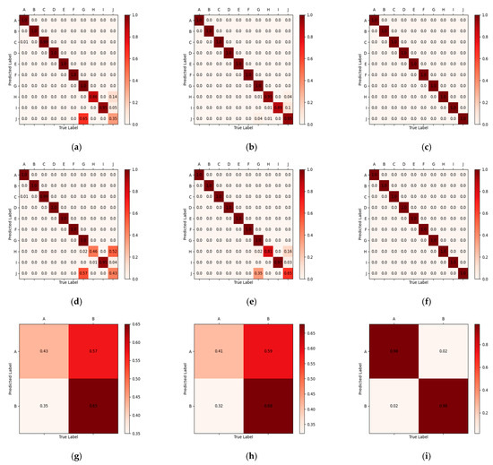 Based on the 2D feature scatter maps described in Section 5.6, we present the corresponding confusion matrix in Figure 9. Similar to the abovementioned analysis, specific emitter J in A1->A2 and A1->A3 is easily identified as G. A small sample of specific emitter H is recognized as J. Specific emitters G, H, and J all come from the same navigation satellite system and the signal formats they transmit are exactly the same, which increases the difficulty of identifying similar individuals. For B1->B2, 57% of the samples from Specific Emitter A are identified as from B, which indicates that A and B are completely inseparable. Although the situation of B1->B3 is relatively optimistic, nearly one-third of the samples from Specific Emitter B are classified as from A. The existing domain adaptive methods suffer limited ability to solve the sample confusion problem. They still cannot provide reliable identification results for some long time span datasets, such as B1->B2 (with a considerable difference between the source domain and target domain). However, even if long time span presents considerable challenges, LTS-SEI can still identify different specific emitters with considerable accuracy. We can see that the classification accuracy of all specific emitter samples is nearly 100%, as shown in the third column of Figure 9. This predictive ability is crucial for practical applications when the labels of new data are not known.