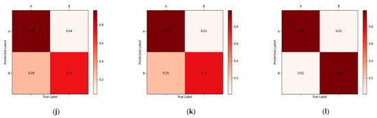 Confusion matrix for identification of different specific emitters: (a) A1->A2 (I/Q), (b) A1->A2 (Shallow layer: CMD), (c) A1->A2 (LTS-SEI), (d) A1->A3 (I/Q), (e) A1->A3 (Deep layer: HOMM), (f) A1->A3 (LTS-SEI), (g) B1->B2 (I/Q), (h) B1->B2 (Shallow layer and deep layer: MMD), (i) B1->B2 (LTS-SEI), (j) B1->B3 (I/Q), (k) B1->B3 (Shallow layer and deep layer: JDA), and (l) B1->B3 (LTS-SEI).