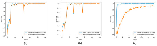 - Center Loss weight and HOMM3 Loss weight : We set the weight factors of the two loss functions to the same value to quickly determine suitable hyperparameters and . The weight range is [0, 1] and the step size is 0.001. We experimentally determined that the domain adaptation ability of the model decreases when the two weight factors are small. The model may overfitting when the two weight factors are large. Model A can maintain a high recognition accuracy on Dataset A when both weight factors are 0.1. Model B can maintain a high recognition accuracy on Dataset B when both weight factors are 0.01.
