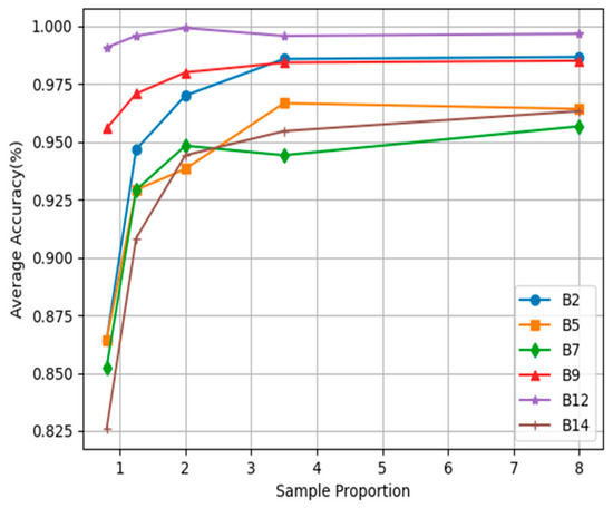 We introduced sample proportion to adjust the number of training samples in a bid to further explore the identification performance of the proposed LTS-SEI method when extended to a small number of training samples. Noteworthily, the sample proportion is defined as the ratio of the number of samples in the training set to those in the validation set. The samples of B1 are assumed to come from the source domain. The samples of B2, B5, B7, B9, B12, and B14 come from the target domain. The number of training samples in the source domain and target domain increases with increasing sample proportion. It is obvious that the greater the sample proportion, the better the recognition performance of LTS-SEI on all data subsets, as shown in Figure 12. Due to the same navigation signal formats transmitted by the two GPS satellites, LTS-SEI confuses different samples when the number of training samples is small. However, the predictive ability of LTS-SEI for new data from B2, B5, B7, and B14 considerably deteriorates when the sample proportion is less than 1.25. The recognition accuracy of LTS-SEI on all data subsets approaches saturation when the sample proportion is 3.5.