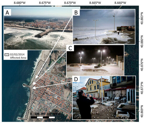 - Tavares, A.O.; Barros, J.L.; Freire, P.; Santos, P.P.; Perdiz, L.; Fortunato, A.B. A coastal flooding database from 1980 to 2018 for the continental Portuguese coastal zone. Appl. Geogr. 2021, 135, 102534. [Google Scholar] [CrossRef]