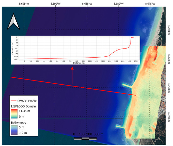 SWASH 1D ‘raw’ profile (red), LISFLOOD domain, and nearshore bathymetry.