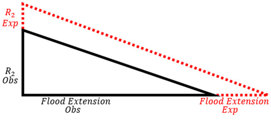 Scheme of the Tilted Bathtub Approach, highlighting the relationship between observed flood extension and its wave run-up, as well as the expected flood extension (red) with its run-up value, respectively.