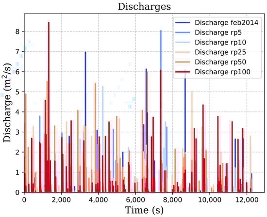 Nevertheless, despite the aforementioned observations, the average discharge rate displayed a progressive increase as the wave characteristics were enhanced, with the exception of Rp10, which exhibited a higher discharge rate compared to Rp25. Notably, the February 2014 event, characterised by the greatest wave peak period, indicated a strong dependency between wave run-up, overtopping, and Tp. It exhibited a mean discharge rate equivalent to that of a storm with a 5-year return period, underscoring its significance. Results are shown in Table 1 and the time series for discharges in Figure 5.