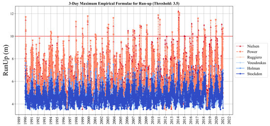 The empirical predictors, here named as NS, PW, HM, RG, VK, and ST, respectively, for Nielsen’s, Power’s, Holman’s, Ruggiero’s, and Vousdoukas’ formulas, are subsequently examined in relation to the run-up levels. For clarity and ease of visualisation, Figure 7 displays the maximum run-up value every three days, considering only values exceeding 3.5 m. A critical threshold of 10 m was adopted, approximately matching the height of the current coastal defence structure—a seawall aligned parallel to the shoreline. This evaluation is conducted using the range of formulas applied to the representative profile, the same as the SWASH setup.