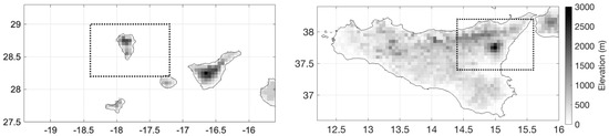 Study area inside the dashed box: Mount Etna (right panel) and the Cumbre Vieja (left panel). Elevation map is represented by gray colors (unit: meters).