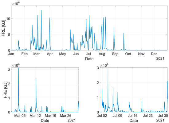 The daily FRE accumulated over the selected box, considering the Etna Eruption in 2021, is observed in Figure 3 (blue line). The maximum of daily FRE released occurred on 12 March, with a release of 126 TJ. Other relative maxima are observed on 4 March (111 TJ), 1 April (102 TJ), and 9 August (105 TJ). It should be stressed that the FRE and FRE maximum values may not occur on the same day, because the maximum FRE corresponds to the day with the longest continuous and intense volcanic activity and not to the day of maximum FRE emission. However, for the period and area under analysis, 4 March was the second day with the highest FRE released, in agreement with the observed in Figure 2. However, Figure 3 shows persistent volcanic activity for several days in February, March, June, and July.