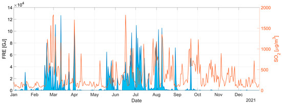 The ejection of SO2 into the atmosphere during the months of the Mount Etna eruption resulted in three distinct peaks of daily maximum SO2 concentrations, as shown in Figure 3 (orange line). Namely, on 28 February, 1 April, and 16 June, with maximum released concentrations of 1775 µg/m3, 1823 µg/m3, and 1820 µg/m3, respectively (Figure 3, line orange). It should be also noted that, as expected, daily concentrations of SO2 follow the intensity of the volcanic activity, revealing a similar temporal pattern as the FRE released during the Mount Etna eruption. This behavior pattern is evident on days with higher FRE values, such as 4 and 12 March (111 and 126 TJ), 1 April (102 TJ), and 9 August (105 TJ), where the concentration of SO2 is higher than 1150 µg/m3 (Figure 3, blue line).