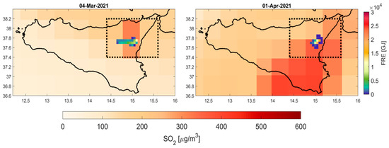 FRE (GJ) and SO2 (µg/m3) concentrations on 4 March (left panel) and FRE and SO2 concentrations on 1 April (right panel). The dashed rectangle represents the area where the accumulated FRP, FRE, and SO2 previously represented were calculated for Mount Etna.