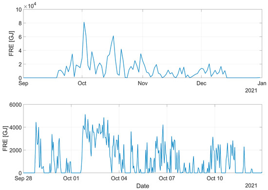 Daily FRE (GJ) from September to December (top panel) and hourly FRE (GJ) from 28 September to 12 October (bottom panel) for the Cumbre Vieja.