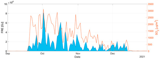 The SO2 concentrations released into the atmosphere during the Cumbre Vieja activity are also related to the FRE values emitted during the eruption periods, as expected. Both the FRE maximum value (8.1 TJ) and SO2 maximum concentration (3122 µg/m3) occurred on 2 October (Figure 6, orange line), and as the FRE diminished due to the volcano’s activity decreasing, the SO2 concentration also declined after 15 December.