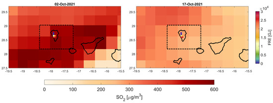 Similarly to the Mount Etna event, two days with high FRE and SO2 values were identified and spatially represented for the Cumbre Vieja eruption, 2 and 17 October, respectively (Figure 7). Regarding the FRE values at the pixel scale, on 17 October, the FRE values (2.7 TJ) were almost of the same magnitude as the FRE values released on the 2nd of October (FRE~2.5 TJ). However, on 2 October more active pixels were detected, making the daily accumulation in the volcano area higher than on 17 October. This behavior is also reinforced by the highest amounts of SO2 released into the atmosphere on 2 October, above 500 µg/m3, whereas the concentration of SO2 was below 300 µg/m3 on 17 October.