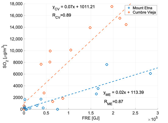Sulfur dioxide emissions affect the balance of the radiative forcing of climate, with several harmful consequences for human health activities and ecosystems. Thus, regarding the protection of human health and activities, there are two SO2 limit values that should not be exceeded, according to the European Air Quality Directive (2008/EC/50) [66]: (i) the SO2 hourly mean value may not exceed 350 µg/m3 more than 24 times in a year, and (ii) the SO2 daily mean value may not exceed 125 µg/m3 more than 3 times in a year. Taking this into account, both SO2 volcanic emissions considered here far exceeded the recommended human health thresholds. Namely, the Mount Etna eruption had 79 days with SO2 concentrations over 500 µg/m3, whereas the Cumbre Vieja had 66 days with SO2 concentrations higher than 500 µg/m3. With respect to what is known for each eruption, the Mount Etna and Cumbre Vieja volcanoes revealed different SO2 plumes, due to the different eruptive activity and dynamics of each volcano and to different local/regional diffusion processes, which were also related to the local orography and meteorological influences. These released SO2 concentrations are also in line with the observed FRE values, in accordance with the peaks of thermal radiance studied by Ganci et al. (2023) [35]; this corroborates the rationale that FRE can be used as a proxy for volcanic emissions into the atmosphere. Therefore, the proposed methodology, based on FRE data, shows that it is possible to assess potential exceedances of SO2 threshold levels, allowing for the issuing of several alerts to protect local populations from the adverse consequences of high SO2 concentrations on human health and activities.