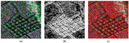 Adaptive filtering windows based on watershed transform of RESM. (a) Pauli decomposed diagram; (b) its threshold RESM; (c) adaptive filtering windows.