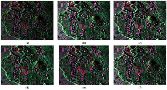 The Pauli decomposition of different filters for Airborne PolSAR data cropped out from Figure 5. (a) Original Pauli image without filtering; (b) Re-Lee Filter; (c) IDAN Filter; (d) NLM Filter; (e) JRP Filter; (f) JSMC Filter.