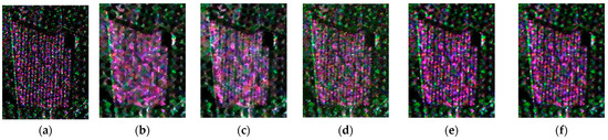 The Pauli decomposition of different filters for region 2 in Figure 12. (a) Original Pauli image without filtering; (b) Re-Lee Filter; (c) IDAN Filter; (d) NLM Filter; (e) JRP Filter; (f) JSMC Filter.
