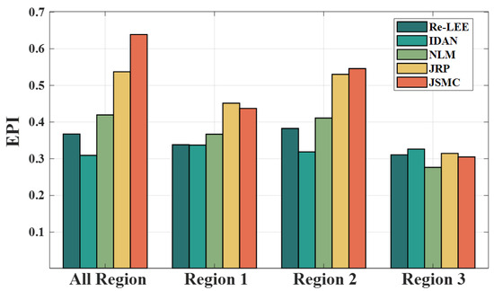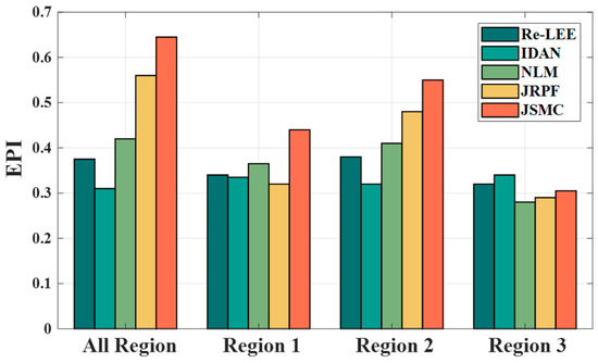 The ENLs and EPIs with different filters are recorded in Figure 8 and Figure 9. Regions 2 and 3 in Figure 8 and Figure 9 correspond to the positions marked by the red boxes in Figure 6, which are independent buildings and eucalyptus trees. Based on these indicators, we can conclude that the JSMC filter has better noise suppression performance and is significantly superior to the other four filters in terms of preserving edge structure.