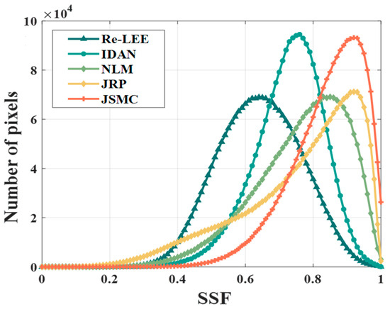 The statistical curves of SSF under different filters are shown in Figure 10, respectively. It can be seen that the SSF curves of the IDAN filter are almost in superposition and their peaks are around 0.73, which is better than the Re-Lee filter. The curve for the NLM filter has a higher peak around 0.85, whereas the peak of the JRP and JSMC filters is near to 0.92 and the curve of JSMC filter is more concentrated, indicating that the proposed method can better maintain the polarization scattering characteristics.