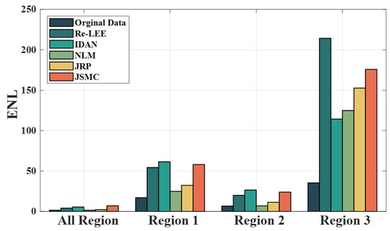 where, represents the mean value of the random variable, and represents the variance of the random variable. ENL characterizes the ability of the filter to smooth speckle noise in a homogeneous region. The larger the ENL, the more obvious the smoothing, and the better the effect of speckle suppression.